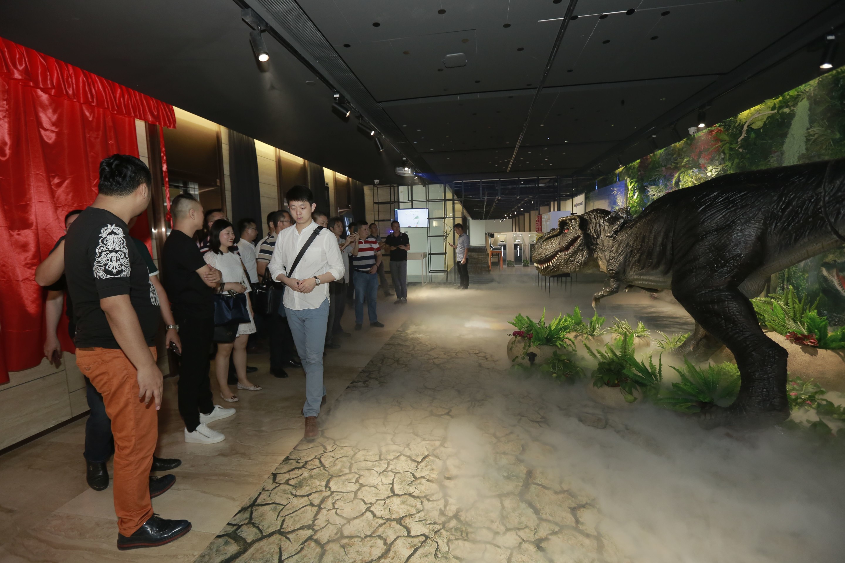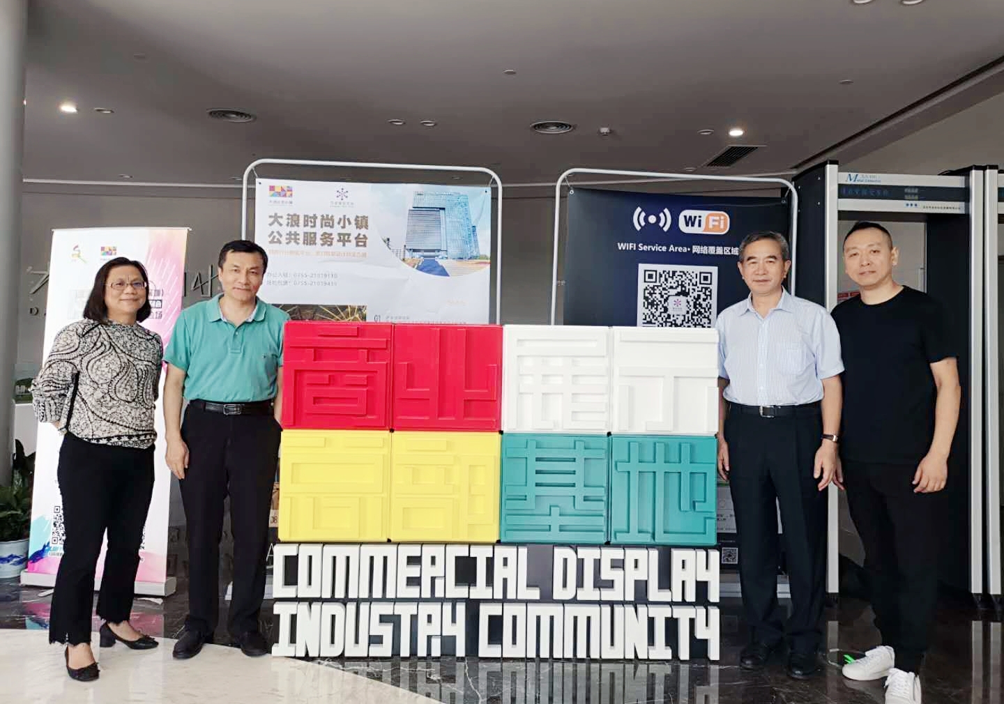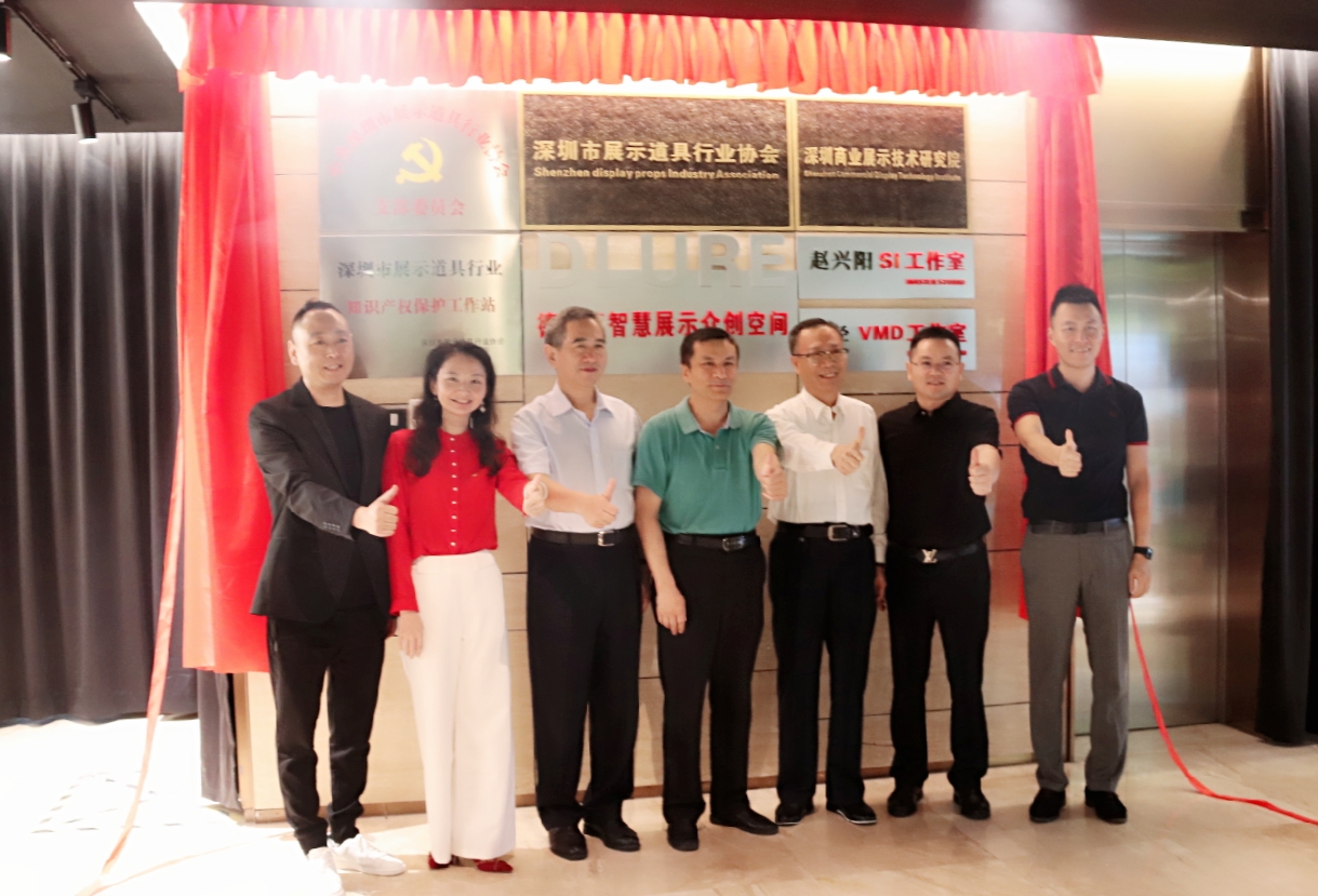大浪時尚小鎮黨委第一書記劉繼琴、深圳市社會組織管理局副局長孫景明、大浪時尚小鎮建設管理中心主任曹宇昕、大浪時尚小鎮黨委專職副書記曾鳳,市政協委員、原市民政局處長駱冰,卡爾丹頓服飾股份有限公司品牌總監胡屹,市展示道具行業協會創會會長駱詩學,商業展示技術研究院、展示道具行業協會秘書長蘇建東,共同為商業展示總部基地揭牌。