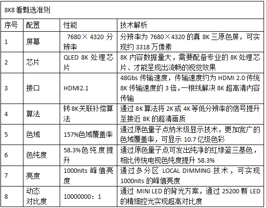 根據8K核心技術不難得出,真正的8K電視,不僅需要屏幕分辨率達到7680×4320,還需配備專業的8K處理芯片,高帶寬的傳輸能力,HDMI2.1接口以及在色域、色純度、峰值亮度、動態對比度上呈現出8K UHD TV最佳顯示效果。如果不具備以上的配置和功能,那么就不能算是真正意義上的8K電視。