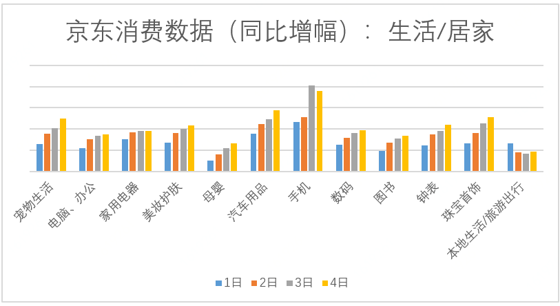 外出旅游如火如荼,“宅”在家中的朋友也不甘寂寞,趁著長假期間在京東平臺上為自己、家人或朋友挑選稱心的商品無疑是最佳的選擇。寵物生活、電腦、母嬰、美妝護膚、汽車用品、手機數碼等商品的銷量在1-4日內持續增長,其中受“京東超級品牌日”等因素影響,手機類商品的銷售增長在3日達到峰值;有意思的是,一些看似與節日無關的消費如圖書、鐘表等相比去年也有較大的漲幅,體現了消費者的多元化需求;而國慶期間的“結婚潮”則拉高了珠寶首飾的相關銷售。