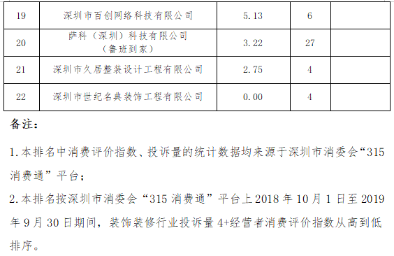 此外,本次公布的深圳市消委會裝飾裝修行業消費評價指數排行榜中,深圳新家生活科技服務有限公司(9.00)、深圳市百創網絡科技有限公司(5.13)和薩科(深圳)科技有限公司(魯班到家)(3.22)3家經營者未建立投訴處理便捷通道,投訴處理效率低于其他經營者,增加了消費者維權成本。