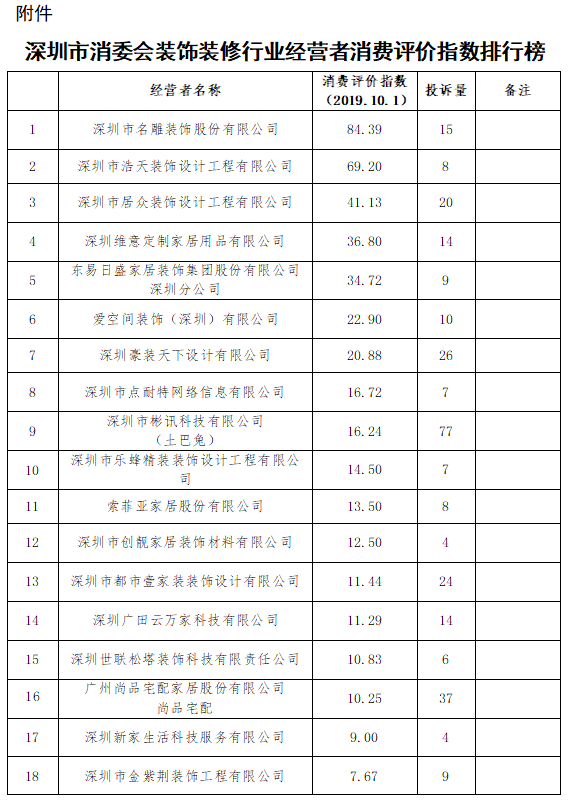 11月20日,深圳市消費者委員會(以下簡稱“深圳市消委會”)首次發布深圳市消委會裝飾裝修行業消費評價指數排行榜。榜單旨在敦促裝飾裝修行業經營者提升商品和服務質量,為消費者提供裝飾裝修消費指引,營造安全放心的消費環境。