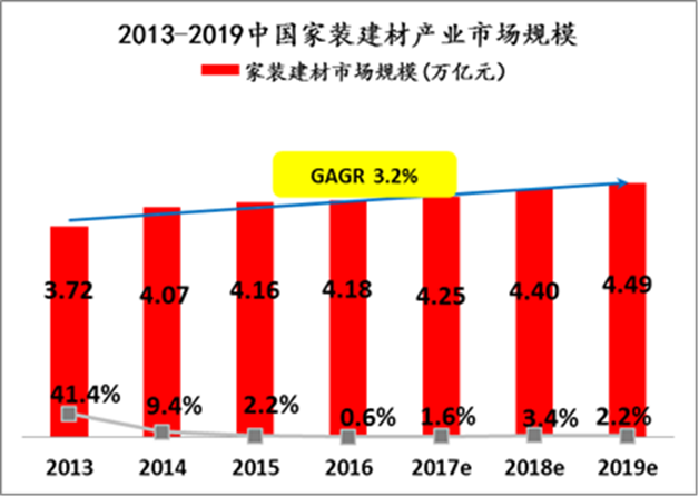 億歐智庫數據顯示,目前家裝市場復合年增長率維持在3.2%,2019年家裝市場銷售規模接近4.5萬億,但家裝建材互聯網滲透率小于10%,經營模式以傳統的區域性“散打”為主,無法滿足90后主體消費者互聯網化、社交化、全國性購買的需求,家裝行業大整合的呼聲越來越高。