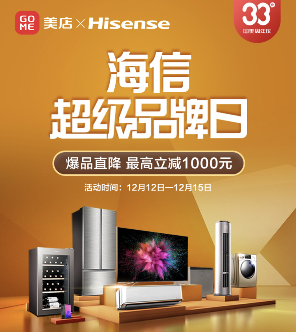 深圳新聞網2019年12月12日訊 12月12日-15日,國美33周年慶活動已經啟動,屆時消費者可在深圳國美門店參與“全場好物,第二件5折起”活動。同時,海信、海爾、美的超級品牌日活動也將于12日-15日期間在國美美店展開。用戶在國美APP中美店活動專區便可參與到活動中來,下面為大家介紹下本次海信超級品牌日的重磅爆品,全場最高立減1000元,還有機會獲得愛奇藝四端VIP會員卡和小度音箱等福利獎品,不要錯過。