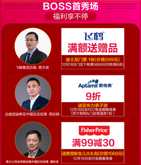 12月18日,蘇寧紅孩子打造了線上線下雙線齊發的“年終狂歡搶購盛典”。母嬰品牌大佬帶頭發福利,飛鶴集團總裁蔡方良、達能紐迪希亞中國區總經理周志剛、美太公司全球副總裁中國區總經理潘秋成、寶潔大中華區幫寶適副總裁任遠,金佰利大中華區董事總經理Mike等豪送價值十萬大禮。活動當天,購相應品牌產品且實付金額最高者就能將戴森吹風機、老鳳祥黃金、迪士尼門票等大禮免費帶回家。