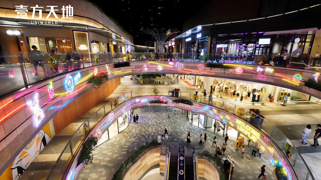 “顏值是第一生產(chǎn)力”,要打造夜間標桿,氛圍營造必不可少。壹方天地將燈飾與建筑、綠植等多個元素巧妙結合,璀璨的景觀燈、夢幻的星星燈、妙趣橫生的IP主題霓虹燈烘托出獨具一格的藝術氛圍。夜晚時分搭配噴泉秀和噴霧,光影夢幻,玉壺光轉,營造出極富層次感的夜景。同時,通過加強外圍的燈光照明等,持續(xù)亮化夜間氛圍,壹方天地成為夜間休閑、聚會的絕佳場所。“消費者沒事也喜歡來走一走,享受工作之余的休閑時光。”潘燦峰說道。