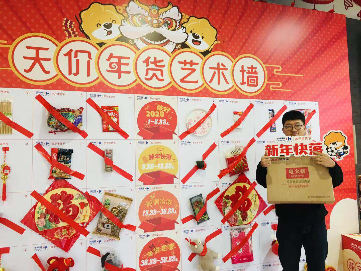 1月10日上午,記者來到家樂福“年味哈濃”天價年貨藝術墻的活動現場,眾多市民正想躍躍欲試。記者發現,在天價年貨藝術墻上,有儂好2020、新年快落、腔調哈濃、年貨老嗲、“鼠”儂最美五類天價年貨。