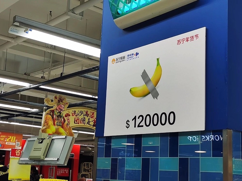 售價12萬美元的香蕉你見過嗎?反正 小編 今天在家樂福 華南區門店 見到了!這可是從美國巴塞爾藝術展 引進的行為藝術。 獲此靈感,蘇寧版“天價年貨” 應運而生!