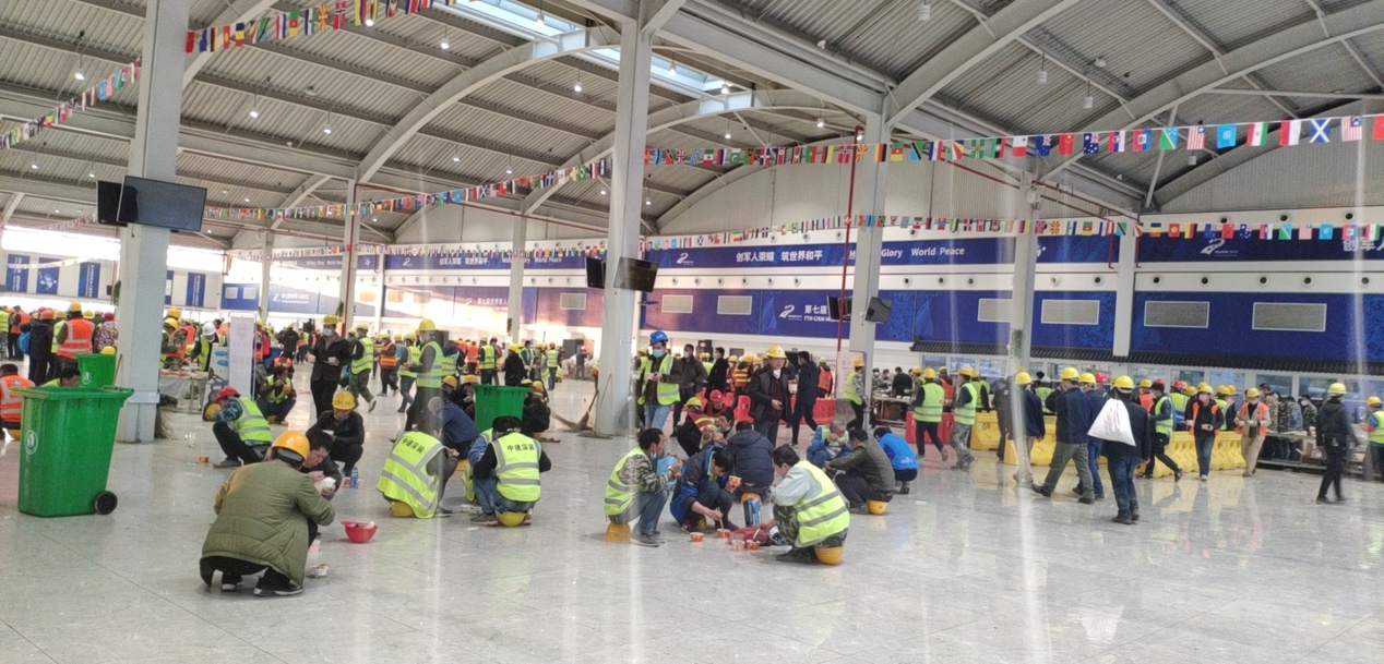 中午就餐時,提醒大家“分開就餐,對疫情時刻保持警惕”的廣播聲不絕于耳。偌大的空地上,不少工人都謹慎地與同事們分開適當距離,蹲在地上開始快速用餐。同樣也包括楊杰,“吃飯要保持距離。我們快點吃完,就能快點回去繼續干。”