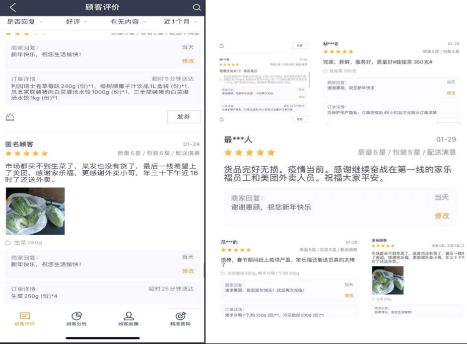 “因新型肺炎病毒的爆發,從大年初二開始,蔬菜、肉類等民生用品成為了市民門的‘搶手貨’,家樂福門店的外賣平臺配送新訂單突然增長,單日訂單量突破上百,很快又到幾百,甚至更多……單個訂單的商品種類多至120件,訂單價格超過3000元,每天每個門店平均需要撥打300通以上的電話。”家樂福華南區電商經理黃福填告訴我們,面對每天逐漸增長的訂單量,自己既是喜悅又是焦慮。為了讓更多顧客享受快捷方便的家樂?!芭渌偷郊摇睒I務,許多門店的伙伴跟他一樣主動放棄春節假期,堅守一線。