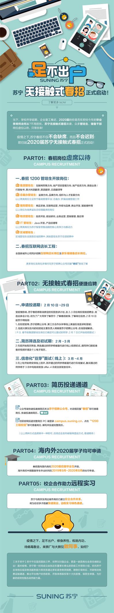 2月8日,蘇寧官方表示,疫情之下,將啟動無接觸式春招,全力保障春招正常進行。春節前確定可面試的畢業生,2月7日已陸續開始視頻面試。