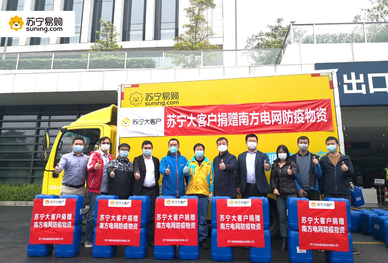 2月12日上午,為實現“共同戰疫”目標,助力南方電網保障民生,蘇寧大客戶聯合廣東華翼在廣州蘇寧物流園區內為南方電網總部捐贈100桶次氯酸鈉消毒液。在疫情面前,每個一線人員都在用自身行動堅定抗疫,蘇寧與供應商伙伴也在用自身的力量為他們提供力所能及的保障。南方電網公司后勤管理中心總經理文茂華、后勤管理中心安保部經理韓忠輝、后勤管理中心綜合部負責人陳小練、主管陳世強一行代表南網接受捐贈。
