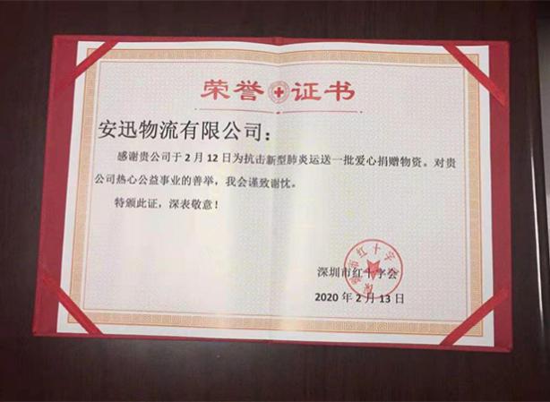 當到兩處捐助地點收集好物資后,國美物流車輛到達深圳市疾控中心已是下午兩點多,一路上兩人水米未進,盡力保證捐贈物資的及時到位。深圳市紅十字會為國美安迅物流發來了榮譽證書,對他們及時運送愛心捐贈物資的善舉表示感謝。