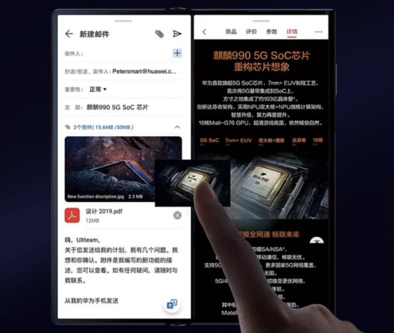 Mate Xs采用8英寸顯示屏,分辨率為2480×2200,折疊時,屏幕尺寸為6.6英寸,分辨率為2480×1440。展開狀態下,華為Mate Xs充分發揮突破視野的視覺空間優勢,在瀏覽視頻、開啟閱讀、使用導航以及游戲影音時,將獲得前所未有的視覺極限與沉浸體驗。此外,通過智慧分屏模式,可以同時顯示、運行多個應用程序,多窗口交互提升應用體驗及操作效率。這種智慧分屏模式提供平行視界、跨屏拖拽、懸浮窗、分屏快捷欄等高頻使用場景智慧生態操作。