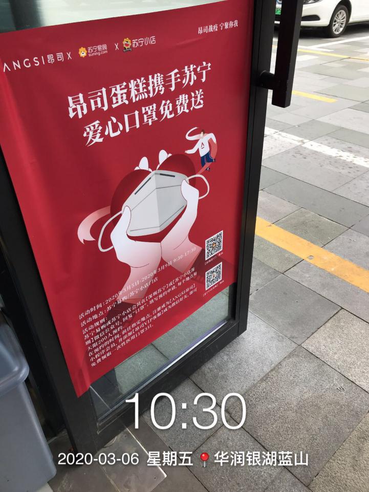 據(jù)悉,本次公益活動(dòng)是深圳蘇寧聯(lián)合昂司蛋糕合作的免費(fèi)送口罩活動(dòng),顧客在網(wǎng)上提前預(yù)約,掃碼即可領(lǐng)取口罩。