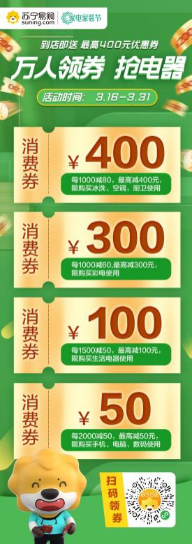 深圳蘇寧針對整個粵東區域投放近20萬張消費券,該券根據可用產品類型分為400元、300元、100元、50元四種不同面值。消費券以電子券為形式發放,消費者可通過深圳蘇寧微信公眾號、深圳蘇寧官方微博、蘇寧云店小程序和蘇寧易購門店進行領取,領取成功后,消費券將自動存儲在消費者的蘇寧會員賬戶中,使用時系統會根據購買的商品類別進行自動適配和抵扣結算。