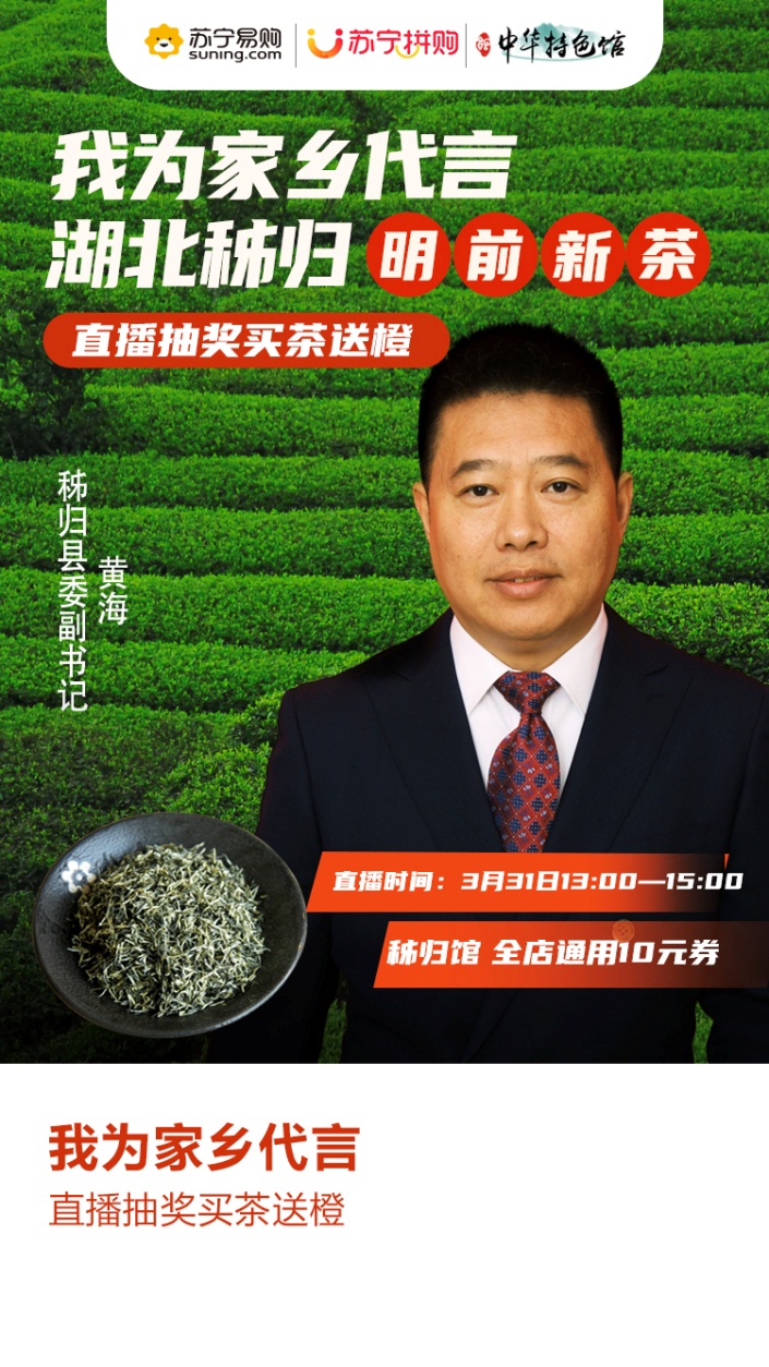 縣長直播帶貨已成風潮,其中誕生了不少網紅案例。3月31日,蘇寧拼購將邀請湖北秭歸縣縣委副書記黃海亮相直播,為全網消費者帶來地道的秭歸農產品。