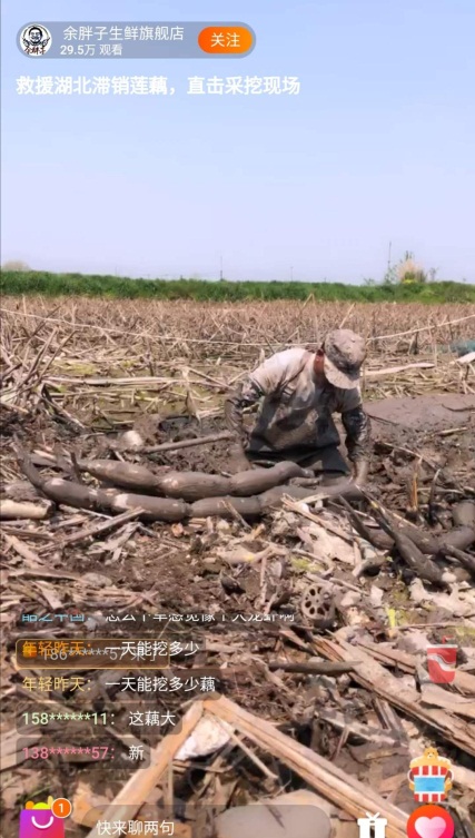 除了湖北的縣長、市長外,普通的湖北商戶不甘落后。8日上午,荊州洪湖的陽光明媚,“余胖子生鮮旗艦店”的店主便打開手機接通了直播,樸實的農民性格讓他面對鏡頭一時不知該說什么好,簡單問好后,他就轉身下了塘,開始從厚重的泥土里拔出一根根新鮮的蓮藕。有不少00后網友是第一次見到挖藕的過程,他們發現原來潔白爽口的大藕居然是從泥中挖出來的,“挖藕真的太不容易了,一個上午要泡在塘泥里。”