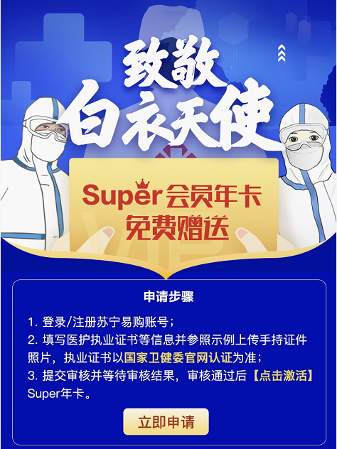 為表達對醫護工作者的敬意,蘇寧對全國醫護人員開放SUPER會員免費申領活動。