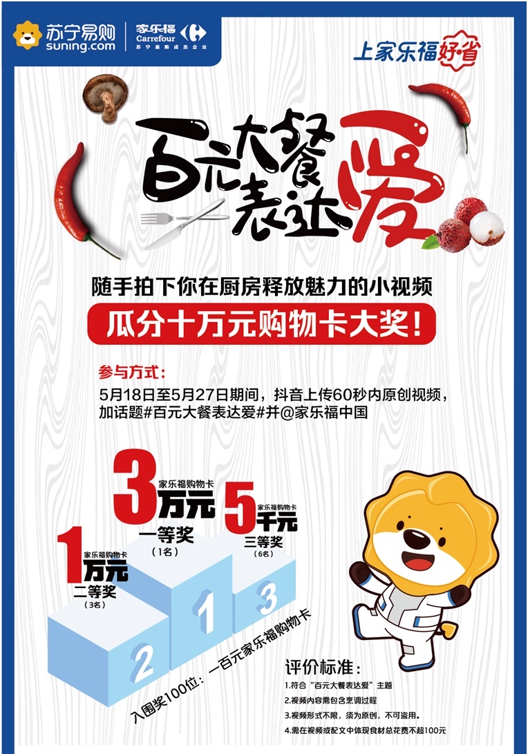 近期陳老伯和女兒聊的最多的除了做菜,還有父女倆都很期待的一場比賽。據悉,5月18日至6月18日,家樂福將舉辦一場主題為“百元大餐表達愛”的鄰家大廚視頻PK賽,鼓勵參賽者做道有故事的菜,向摯愛的人表達濃濃的情意。你負責做菜,家樂福負責買單。你無需具備可媲美專業廚師的高超技藝,僅需擁有一顆熱愛美食的心和一雙巧手,無論是國人經典標配的“四菜一湯”,抑或是最適合情侶的西式浪漫—牛扒配紅酒,隨你發揮。以百元預算準備食材,將烹調過程上傳抖音。屆時,突圍選手將有機會瓜分價值十萬元的購物卡大獎。