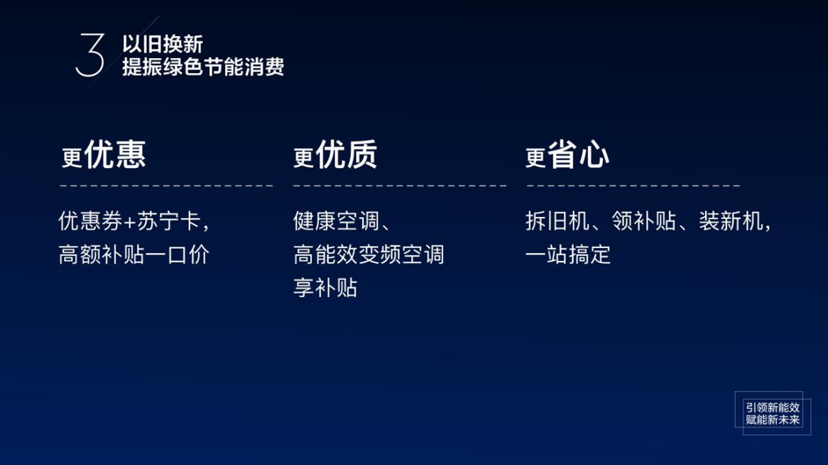 蘇寧發起“深呼吸計劃”,為消費者搭建全套健康空調標準,全年發放100億健康補貼。以健康空調優惠、分期免息、0元試用等形式,加速健康空調產品的升級迭代。