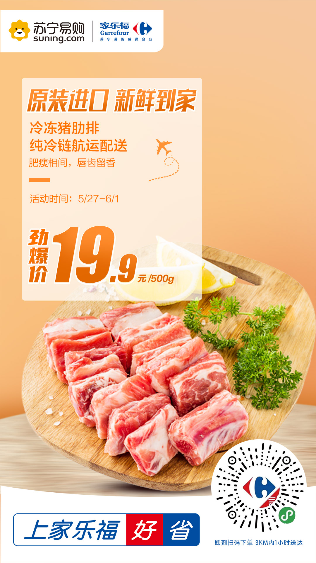 進口冷凍豬肋排是本次活動的主推爆品之一。生豬按照歐盟標準養殖,采用非轉基因飼料喂養,全程不使用抗生素,原廠精切,采用純冷鏈航運配送,全程可溯源。肥瘦相間,讓人唇齒留香。豬肉價格高企的背景下,這款進口豬肋排原價39.9元/500g,活動期間僅售19.9元/500g,價格十分惠民,絕對是秒殺爆品。此外,家樂福還準備了澳洲黃牛肉36.8元/斤、帶皮后腿肉19.9元/斤、小龍蝦19.9元/盒、波士頓龍蝦+三文魚的組合預售。誠意滿滿,只為滿足“食肉獸”的大胃口!