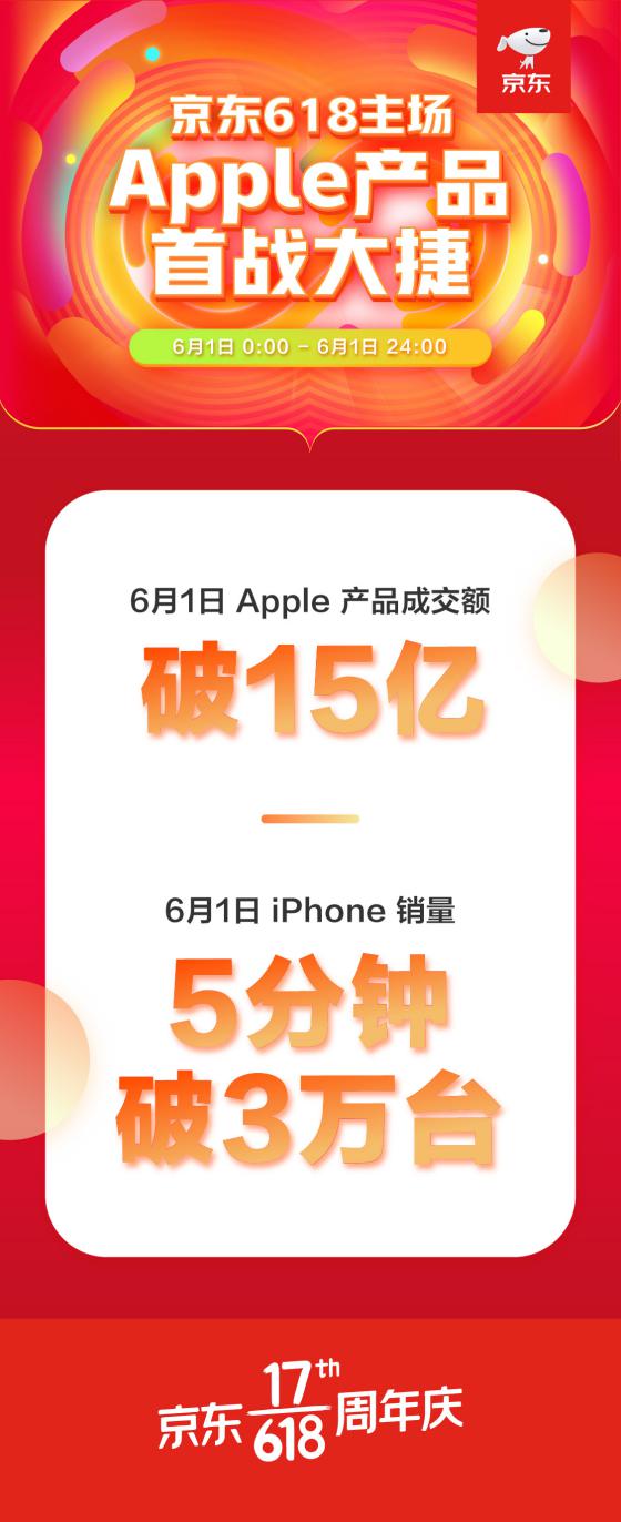 京東618開啟首日,Apple品牌接連創下銷售記錄:僅5秒銷售額就突破1億;5分鐘后,iPhone銷量突破3萬臺;全天成交金額達到15億。