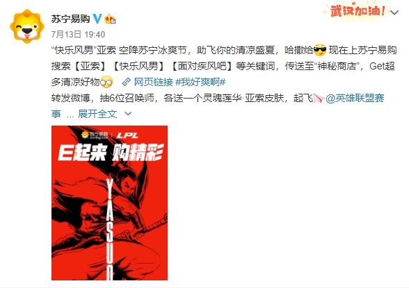 另據蘇寧官方消息,7月11日~7月18日蘇寧冰爽節期間,除每千減百、百億補貼,蘇寧冰爽節亞索主題會場還為英雄聯盟玩家粉絲帶來了亞索新皮膚“靈魂蓮華”、風扇等好物組成的“快樂大禮包”,用戶可通過下單購物、微博互動等方式獲取。