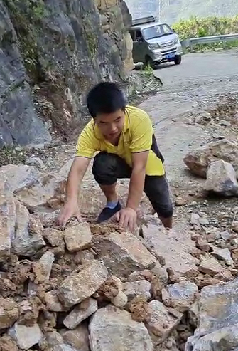 由于前期暴雨天氣,焦厚松車才開到半路,就看到前方的路有了滑坡,緊靠著崖壁的道路已經垮了一半。“掉頭還是前行?”焦厚松最終戰勝了猶豫,“答應了用戶今天送到,不能就這樣放棄,先看看情況。”他開始下車觀察路況,發現主要是碎石堵住了前方七八米的路程。“如果清理一些,車輛就能開過去。”說干就干,焦師傅隨后就開始徒手清理路上的石塊。