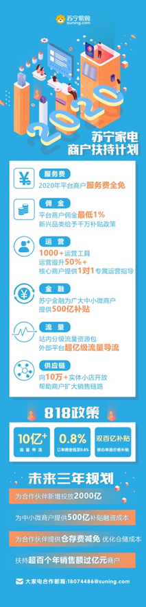 蘇寧宣布,2020年蘇寧將免收平臺商戶服務費;平臺上的商品供應鏈會向蘇寧生態中10萬+實體小店開放,幫助商戶擴大銷售通路。同時,大家電行業線將持續給平臺商戶匹配站內外的億級流量,并通過星河生態賦能平臺開放1000+運營工具,針對核心商戶提供1對1專屬運營指導,借此幫助商戶有效提升經營效率,降低運營成本。818期間,平臺訂單傭金從最低1%降至0.8%,針對核心單品提供雙百億補貼,且向平臺商戶給予10億+的流量導流扶持,幫助商戶全面應戰818。
