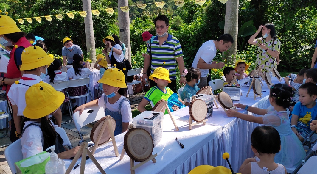 在自然課堂,分為科普展覽區、繪畫活動區和蜂產品體驗區,孩子們戴著黃色的卡通帽子,像一只只勤勞的小蜜蜂忙碌地參與各項活動。在科普展板前,他們認真記錄蜜蜂的基本知識、品質精神,了解蜜蜂與人類的關系、保護生物多樣性的重要性,家長們結合展板耐心講解《深圳經濟特區科學技術普及條例》、全國科普日、深圳科普月等知識。