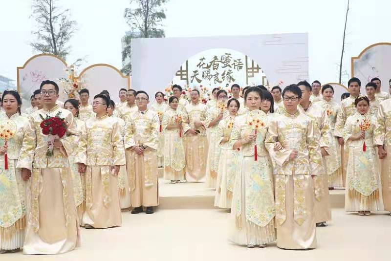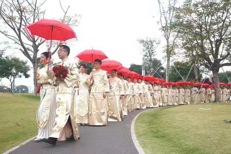 活動伊始,新人手舉紅傘穿過連理橋,在玫瑰園情話闖關(guān),在中西禮堂進(jìn)行找新娘等默契互動,在自然展覽廳俯瞰香蜜公園全貌,與林立高樓與大片叢林相映成景的最美天際線合影,最后在氤氳浪漫的花香湖和花蜜湖畔,在親友與來賓的祝福下,40對新人身穿中式禮服,誦讀莊嚴(yán)的誓詞,許下今生不變的承諾。