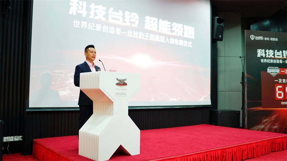 深圳市工業(yè)展覽館副館長潘文峰,深圳電動車產(chǎn)業(yè)促進委員會執(zhí)行會長楊華,臺鈴集團董事長孫木鉗、臺鈴集團總裁助理兼公關總監(jiān)胡東文等嘉賓齊聚深圳市工業(yè)展覽館,參加了以“科技臺鈴超能領跑”為主題的世界紀錄創(chuàng)造者——臺鈴豹子超能版入館收藏儀式,共同見證了這一榮光時刻。