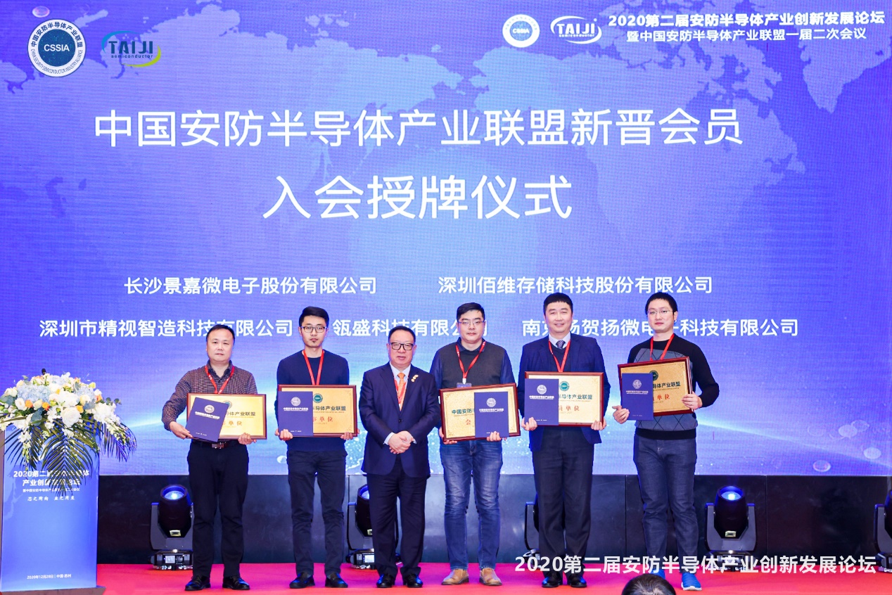 會議尾聲,還舉行了中國安防半導體產業聯盟新晉會員單位入會授牌儀式。深圳佰維存儲科技股份有限公司、長沙景嘉微電子股份有限公司榮膺聯盟理事單位,瓴盛科技有限公司、深圳市精視智造科技有限公司,南京揚賀揚微電子科技有限公司榮膺聯盟會員單位。中國安防半導體產業聯盟主席楊金才為以上單位進行授牌。