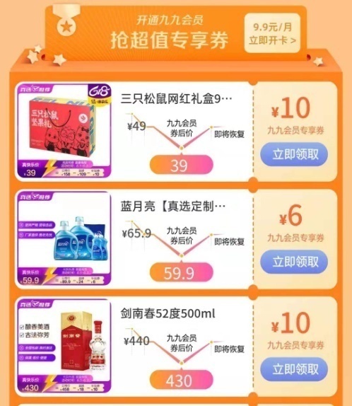 活動期間,九九會員可搶專享大額券,大牌網紅爆品狂歡底價。三只松鼠網紅堅果禮盒998g*2券后價39元,藍月亮洗衣液禮包券后價59.9元,劍南春52度500ml酒券后價430元......實實在在讓用戶買到“真低價”,買的“真值得”!