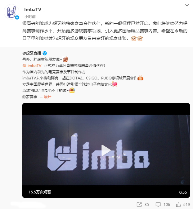 本次虎牙公司和imbaTV達成合作,不僅能加強雙方在DOTA2、CS:GO、PUBG等品類賽事上的優勢,也與虎牙對電競賽事多元布局的計劃高度契合。