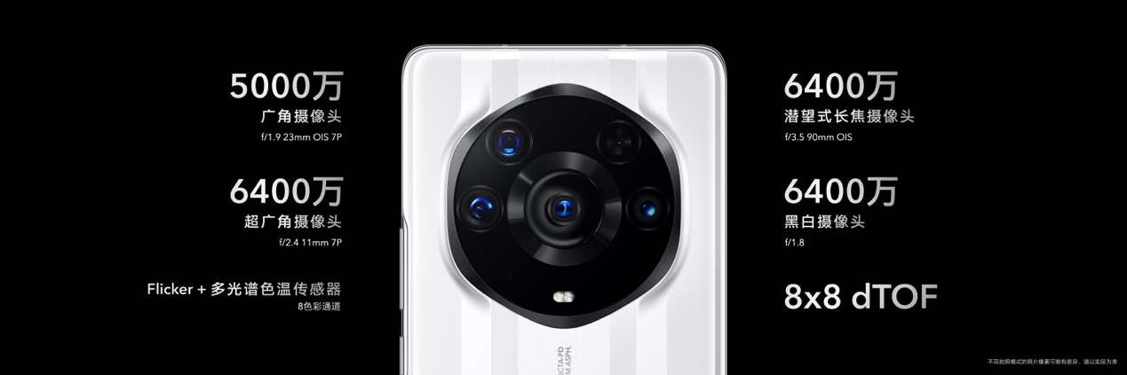 影像方面,榮耀Magic3至臻版打破手機鏡頭天花板,突破性地采用了多主攝設計。在與榮耀 Magic3 Pro采用同樣的業(yè)界領先6400萬潛望式長焦鏡頭和6400萬黑白鏡頭基礎上,榮耀 Magic3至臻版將5000萬像素超大底主攝升級為索尼 IMX700,傳感器尺寸達到1/1.28英寸,擁有業(yè)界領先的感光度(ISO),成像解析力、暗光拍攝能力更強。而超廣角微距鏡頭,也從1300萬像素,升級為業(yè)界領先的6400萬像素126°超大廣角微距鏡頭,能完美呈現(xiàn)廣闊空間中整個建筑、地標,亦能捕捉2.5cm近距離下的微小細節(jié),提供肉眼無法看到的創(chuàng)意視角。多主攝計算攝影,實現(xiàn)多焦段高清影像。