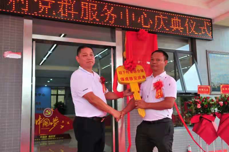 在落成典禮中,深圳安宏基控股集團有限公司彭康輝董事將大樓辦公鑰匙移交給硁下村黨支部書記彭志康。村支書彭志康、五云鎮慈善會會長彭志響一起贈牌匾給深圳安宏基控股集團有限公司彭康輝董事。