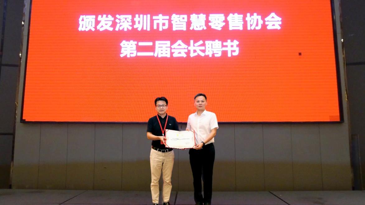 同期,深圳市智慧零售協會,在此舉行四年一度的換屆選舉大會。經過無記名差額投票選舉,天虹數科商業股份有限公司董事長高書林連任深圳市智慧零售協會會長,由深圳市對口支援新疆工作前方指揮部副總指揮、深圳市商務局副局長管耀華為其頒發聘書。