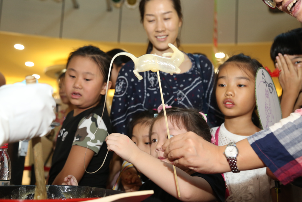 現場,糖人制作師傅安靜地坐在展臺前,任人群在身邊走走停停,埋頭專注捏著各式形狀。只見他用竹篾緩緩攪拌麥芽糖,挖出一團放在手里揉捏拉扯,做出一個小管子,抿嘴往里吹氣,麥芽糖慢慢膨脹并逐漸變成透明,再迅速捏出頭和腳,一只糖老鼠便活靈活現地被“吹”了出來。“太神奇了,麥芽糖在叔叔手中變成了‘活’的,沒想到傳統手工藝如此出神入化。”10歲的玥玥瞧得津津有味,她說,比起逛商場和游樂場,這樣的體驗活動不僅能感受到中華傳統文化,還可以學到很多課本以外的知識。