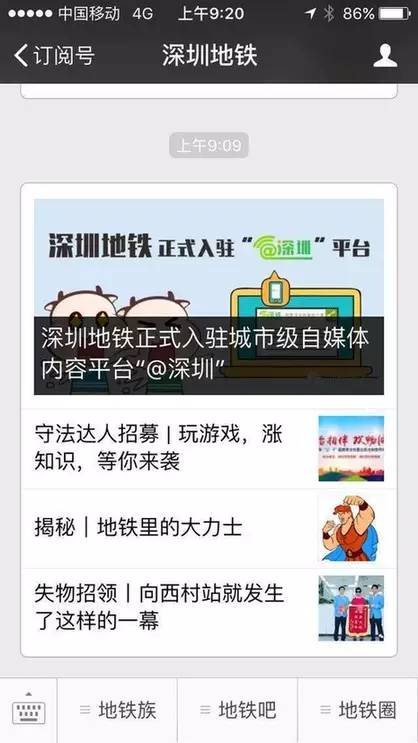 “深圳地鐵”是深圳軌道(地鐵)運(yùn)營唯一的官方微信,每日發(fā)布最有時(shí)效的地鐵運(yùn)營相關(guān)資訊及各類地鐵相關(guān)知識(shí),聚焦市民最關(guān)心的“暢通出行”。在“深圳地鐵”可以看到運(yùn)營資訊、地鐵知識(shí)科普、地鐵活動(dòng)等各類與地鐵相關(guān)的信息。“深圳地鐵”除了每天定時(shí)發(fā)布的各類地鐵資訊外,還可以讓市民在線對(duì)地鐵運(yùn)營狀態(tài)及服務(wù)、設(shè)施設(shè)備等進(jìn)行投訴或建議,同時(shí),也對(duì)在地鐵內(nèi)丟失物品的乘客提供了一個(gè)“失物招領(lǐng)”的查詢平臺(tái)。截至目前,粉絲數(shù)近50萬。