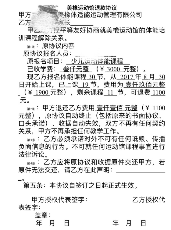 我于2017年8月30日續報深圳市美橡體適能運動管理有限公司體能課程,已經是第三次報了,每次3000元,30節課,都是與教練微信溝通與轉帳。2018年1月10日收到該公司通知說結束體能館的業務,不再營業,說統一給我們退剩余的課程費用,12號加了該公司財務微信溝通相關退費事宜,財務說統計好在一周內統一給我們退費,19號收到財務信息,說可以退回1100元,還說幾天后可以退款,并說好通過微信退還(當時壓根沒有說簽協議后再退),一周拖一周,在23號忽然發微信來通知說要求去簽協議才退款,當天又進行了協商,因為我帶倆小孩實在抽不出時間去他們公司,能否把協議發到我郵箱確認,財務說先與他老板匯報后第二天給回復,但第二天也沒有收到任何回復,然后又問財務協議發過來了嗎?財務二話沒說就把協議通過微信發給我,當時想想簽了就算了,但細看第三、四條真的很難讓人接受,內容詳見附件1。我們交費的時候什么協議、收據對方都沒給,現在退錢就要求我們簽協議,而且是霸王條款,還叫我寫上“我自愿終止培訓課程”,老天哪是我自愿的,真是有種迫良為猖的感覺,還有第三條,也太污辱人格了,再次和他們友好協商希望把協議第三條改了,對方視而不見,不理不睬,也不積極回應。