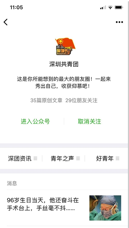 案例介紹:“深圳共青團”微信公眾號于2013年開通,是全省最早開通的政務(wù)微信號。在近兩年加大力度建設(shè)和推廣后,粉絲數(shù)有了飛躍性的增長,推送閱讀量和影響力也有了比較明顯的提升。截至目前,累計推送1700余篇,平均閱讀量1萬以上,單篇最高閱讀量達到36萬,粉絲數(shù)90余萬。目前,公眾號影響力在全國地市級團委中排名前3,在全市政務(wù)新媒體中排名前5。在發(fā)布的內(nèi)容上,主要關(guān)注時政要聞、社會熱點、政策解讀等與青年息息相關(guān)、喜聞樂見的話題內(nèi)容,弘揚愛國精神和時代精神,是深圳共青團聯(lián)系、引導和服務(wù)青年的重要載體。
