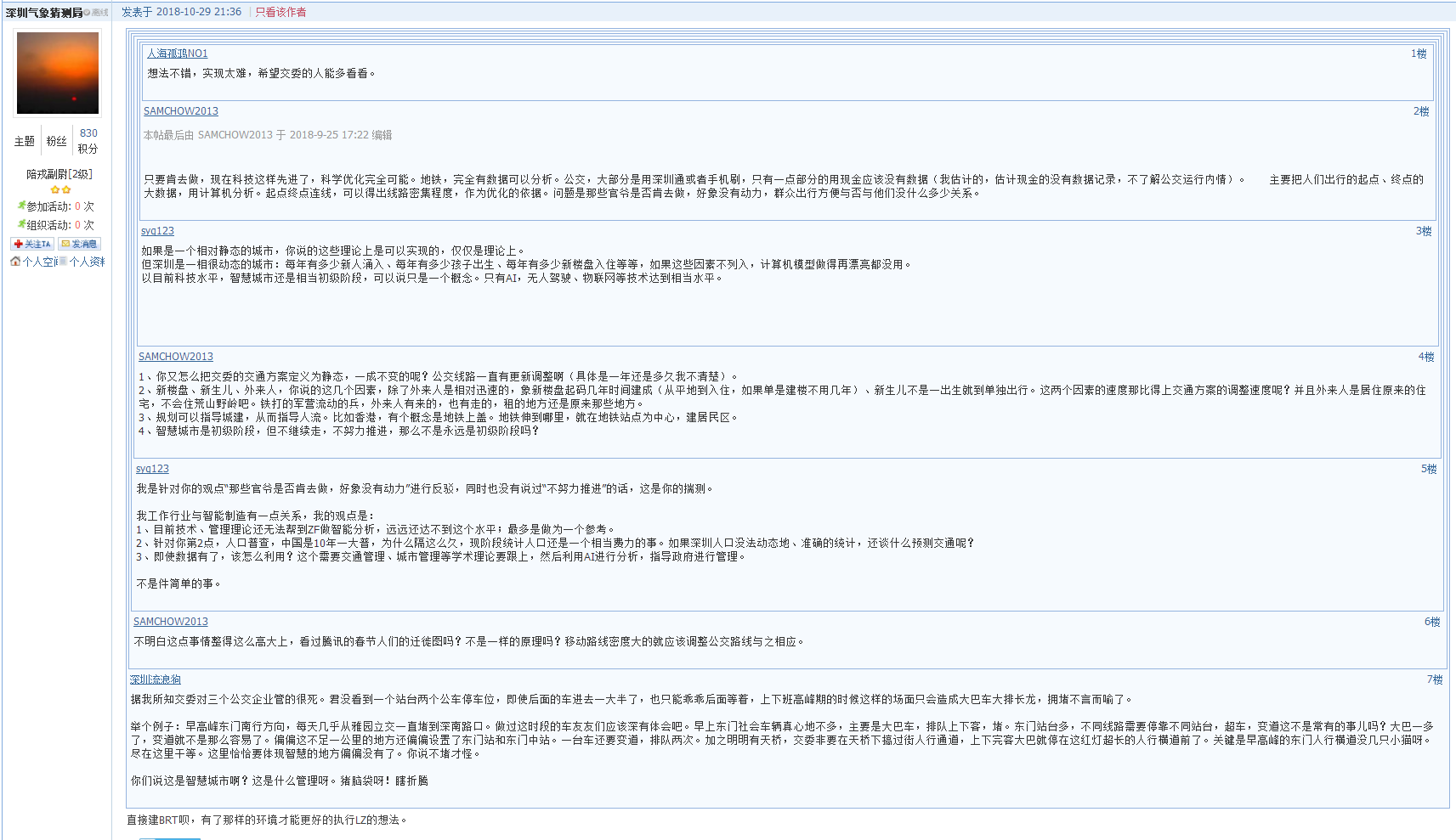 9月25日有市民在深圳論壇以《關于公交線路規劃和站臺設置的一點建議》為題發帖,自稱是曾經的公交人和現在的私家車駕駛員,對深圳的公交出行一口氣提出3個意見。帖文中最為吸引人眼球的觀點就是“將全市各站點進行編號,采用計算機技術,對編號站點進行排列組合,每個方向連續的10個站點有三條線路覆蓋,超出三條屬于線路密度高或規劃不合理。”單這一句話就在跟帖中引發了針鋒相對的辯論,有支持的市民認為:主意不錯,實現起來應該也難度不大。現在不是整天提什么物聯網、大數據、智慧城市么,這個不就是這些高新技術在公交出行方面的應用。不看好的市民則認為:目前技術、管理理論還無法做智能分析,遠遠還達不到這個水平,“最多是做為一個參考”。