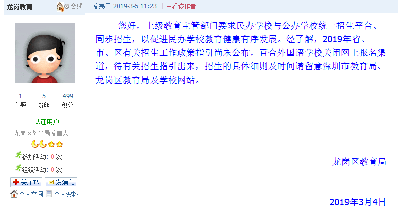 3月5日11時23分,龍崗區(qū)教育局官方賬號發(fā)布回應網帖,回應稱“上級教育主管部門要求民辦學校與公辦學校統(tǒng)一招生平臺、同步招生,以促進民辦學校教育健康有序發(fā)展。”“2019年省、市、區(qū)有關招生工作政策指引尚未公布,百合外國語學校關閉網上報名渠道,待有關招生指引出來,招生的具體細則及時間請留意深圳市教育局、龍崗區(qū)教育局及學校網站。”