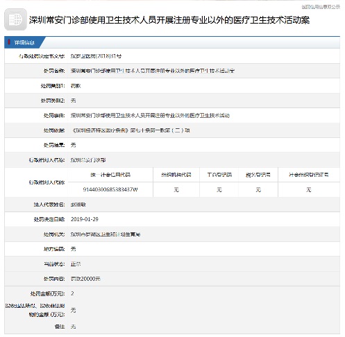 記者從羅湖區政府在線了解到,1月29日,羅湖區衛生和計劃生育局對市民投訴的門診部已作處罰,處罰事由為,深圳常安門診部使用衛生技術人員開展注冊專業外的醫療衛生技術活動,罰款金額為20000元。與此同時,針對市民投訴違規行醫的醫生也作了處罰,處罰理由為,開展注冊專業以外的醫療衛生技術活動,罰款金額為5000元。