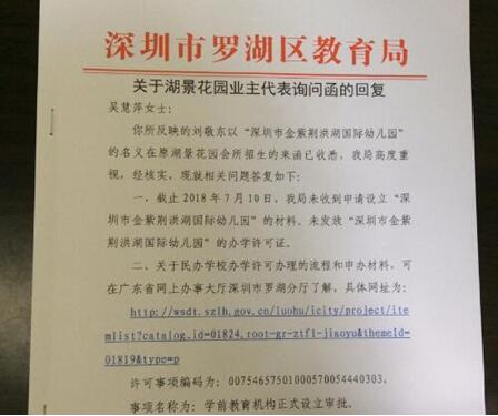 6月16日,市民在深圳論壇以《舉報湖景花園會所開辦幼兒早教班違法招生》為題發帖反映,羅湖區湖景花園第四屆業主委員會于2018年7月曾去函羅湖區教育局,詢問“深圳金紫荊洪湖國際幼兒園”是否具備招生資格。教育局明確回復:未收到該幼兒園的申請資料,也未發放該園的辦學許可。