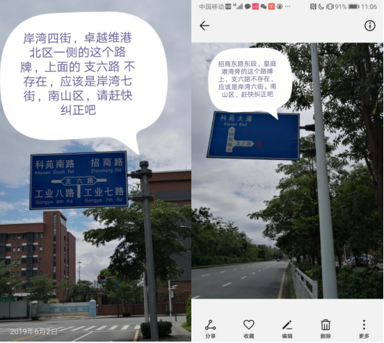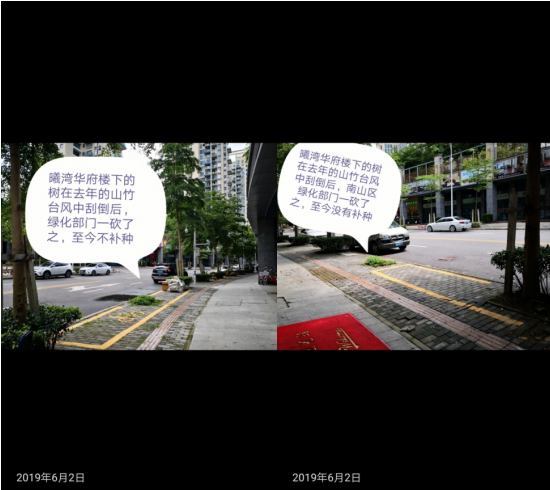 “南山區城管局當時回應道:‘因臺風砍倒的樹木將會統一采購,盡快予以補種;有問題的路牌將于七月底前更換。會盡快聯系南山稅務部門,修復有問題的井蓋’”,該市民卻對管理部門的工作效率提出質疑:“然而現在距離投訴已經兩個月了,問題依然存在。工作效率如此之低?”
