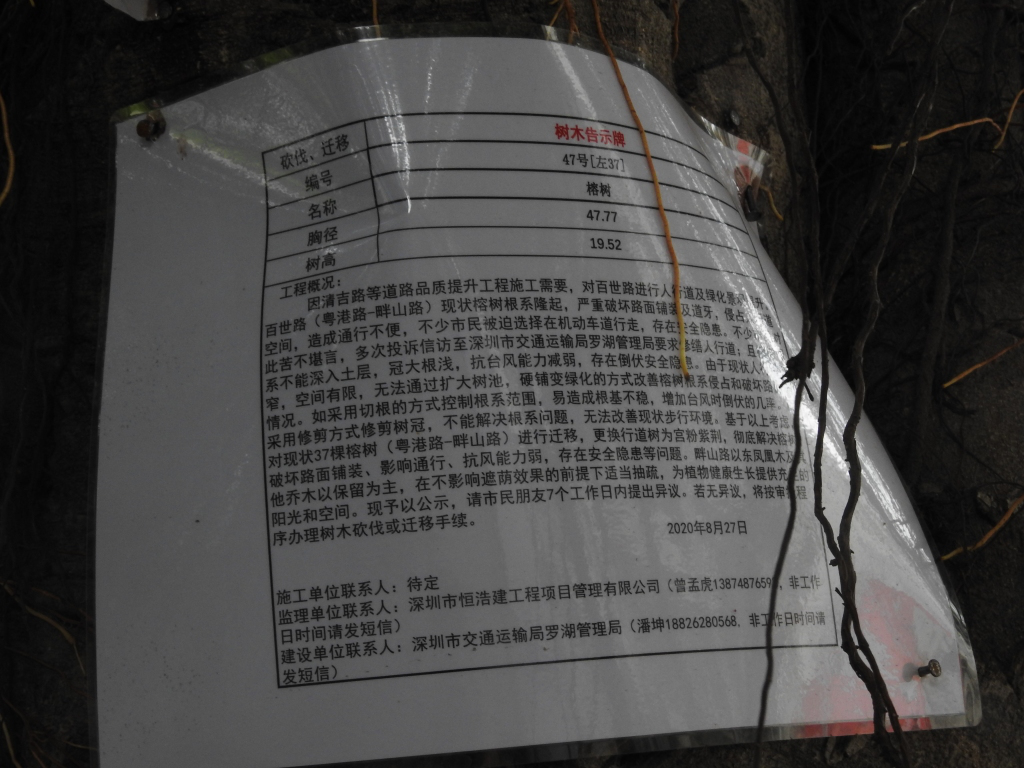 9月6日,有網民在深圳論壇發帖《深圳版的指鹿為馬,蓮塘為了砍樹,不是榕樹硬說是榕樹》反映,稱“百世路邊大樹貼上一張張紙條,大意是這些榕樹根系發達,破壞人行道、路牙和機動車路面,為了精準提升,所以要移除砍掉!仔細看看,這些行道樹根本就不是榕樹,而且沒有損壞道路路面,至于路邊的人行道,是這兩年才修建有的,之前屬于路邊綠化帶,種花草?!笔嗄陙頉]有一棵樹被臺風吹倒!該網友稱影響該路段市民出行另有原因,“至于市民被迫在機動車道上行走,那是道路的兩邊停滿了機動車,很多都是僵尸車,沒人管。”