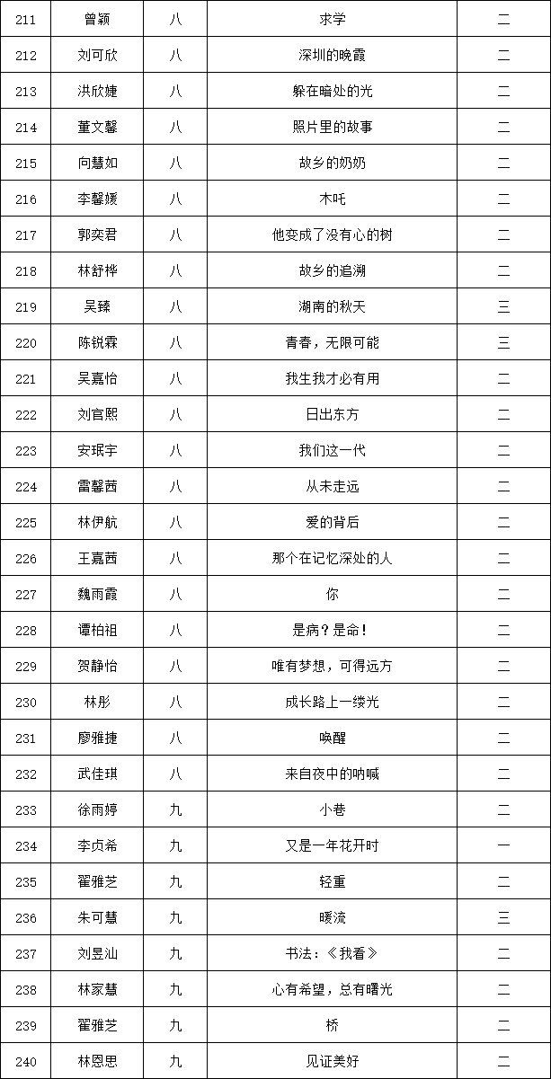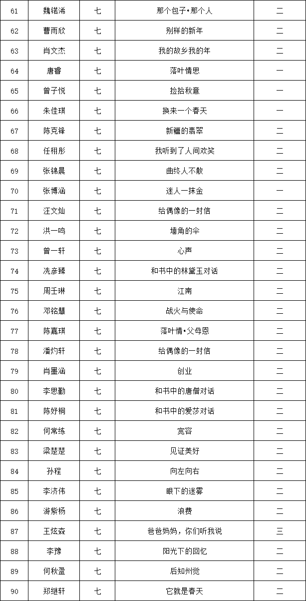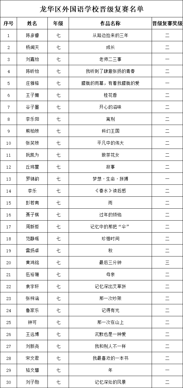 自2021年1月,活動征稿啟動以來,獲得了深圳市廣大中小學生、教師、文學愛好者的熱烈響應積極參與,吸引了深圳百余所學校的上萬人關注報名。現公布龍華區外國語學校專場晉級復賽名單如下: