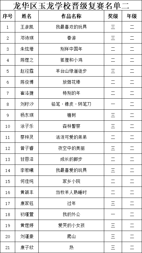 自2021年1月,活動征稿啟動以來,獲得了深圳市廣大中小學生、教師、文學愛好者的熱烈響應積極參與,吸引了深圳百余所學校的上萬人關注報名?,F公布龍華區玉龍學校專場第二批晉級復賽名單如下: